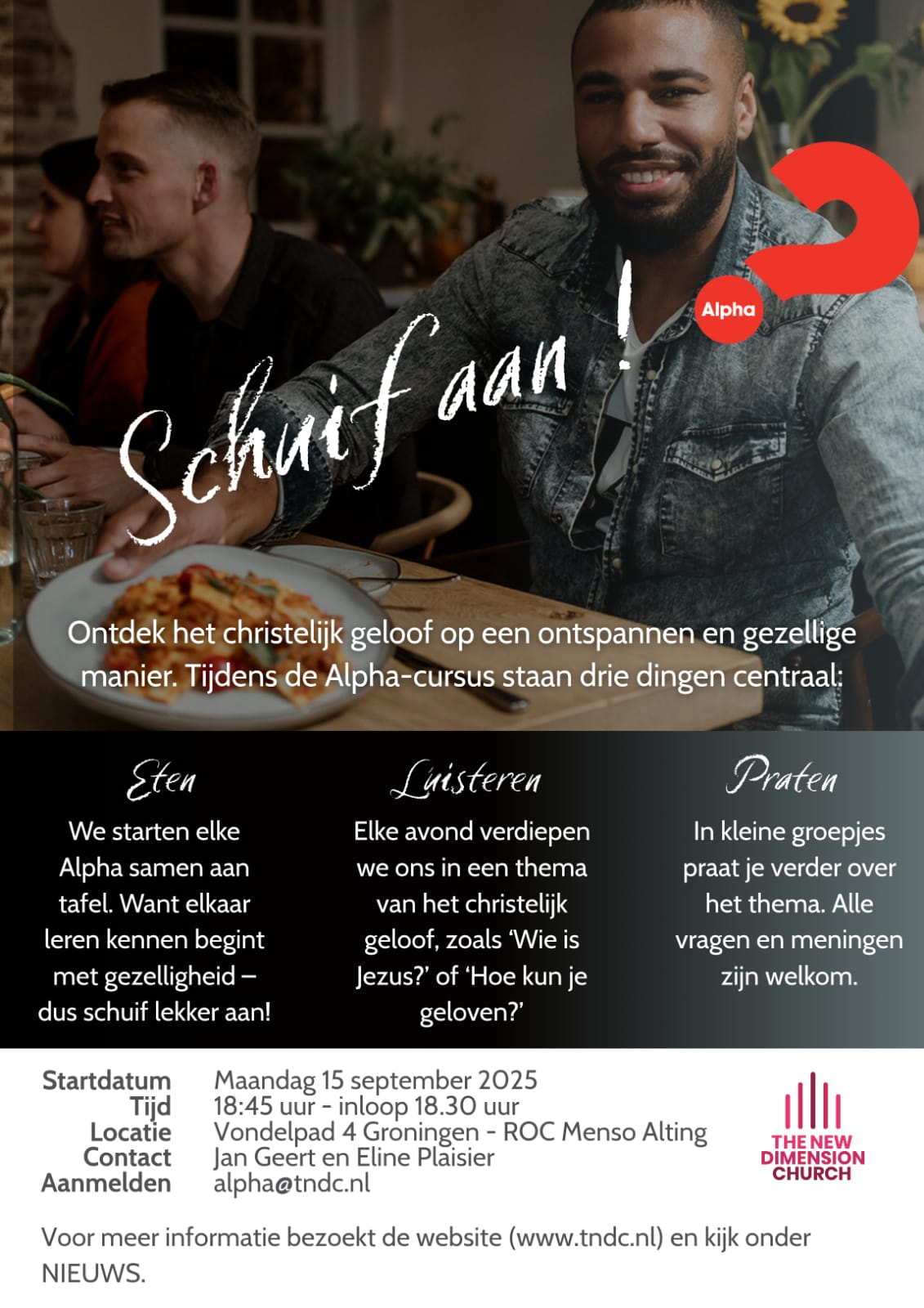 Lees verder!Alpha is laagdrempelig en geeft antwoorden op de meest gestelde vragen over het christelijk geloof. De alpha cursus bestaat uit dertien avonden en een weekend waarin de onderwerpen over de Heilige Geest centraal staan.